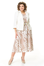 Костюм трехпредметный, состоящий из жакета, брюк и блузки. Жакет на подкладке полуприлегающего силуэта с застежкой на петли и пуговицы, по переду обработаны прорезные карманы с клапаном, рельефные швы. Спинка со средним швом и вытачками. Рукав втачной, двухшовный. Блузка прямого силуэта, с нагрудными вытачками, разрезами в боковых швах, рукав втачной короткий. Брюки на поясе, прямые, слегка заужены к низу, застежка на пуговицу и тесьму молнию.