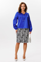 Жакет полуприлегающего силуэта, удлиненный, двубортный с застежкой на завязывающиеся пояса контрастных цветов. На правой части переда по краю борта вставка из контрастной ткани, край борта закругленный. Горловина оформлена воротником пиджачного типа – верхний воротник и правый лацкан из отделочной ткани. Перед с рельефами из проймы, в нижней боковой части выполнен прорезной карман в рамку и клапаном. Спинка со средним швом и двумя рельефами. Рукав втачной, одношовный, короткий.