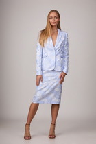 Длина жакета по спинке около 72 см в размерах 40-46 и около 74 см в размерах 48-52, длина рукавов около 62,5 см. Длина брюк по боковому шву с поясом около 99 см в размерах 40-46 и около 100,5 см в размерах 48-52, длина по внутреннему шву около 69,5 см.