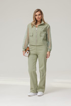 Длина жакета по спинке около 66 см в размерах 40-46 и около 69 см в размерах 48-52, длина рукавов около 61 см. Длина брюк по боковому шву с поясом около 113 см в размерах 40-46 и около 114,5 см в размерах 48-52, длина по внутреннему шву около 82 см.