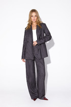 Текстильный костюм-двойка из классического двубортного жакета и прямых брюк-палаццо со стрелками.