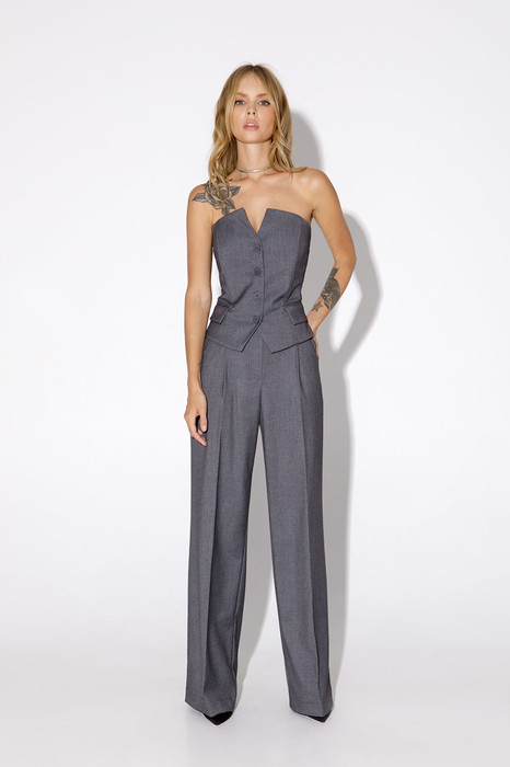 Текстильный костюм-двойка из топа-корсета и прямых брюк-палаццо со стрелками.