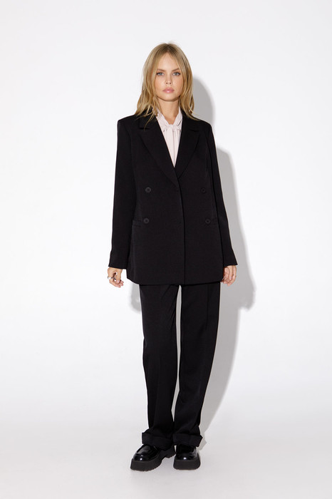 Текстильный костюм-двойка из двубортного оверсайз жакета и прямых брюк с высокой посадкой. Детали: жакет прямого силуэта, пиджачный воротник, прорезные карманы, спинка со средним швом, втачные двухшовные рукава, жакет на подкладке. Брюки на притачном поясе со шлевками, передние половины с небольшими мягкими складками и заутюженными стрелками, застежка на молнию и пуговицу, боковые карманы.
