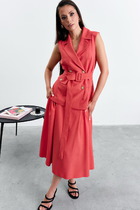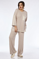 Длина жакета по спинке около 70 см в размерах 40-46 и около 73 см в размерах 48-52, длина рукавов около 62 см. Длина брюк по боковому шву с поясом около 112,5 в размерах 40-46 и около 114 см в размерах 48-52, длина по внутреннему шву около 80 см.