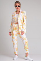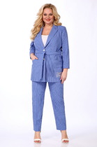 Длина жакета по спинке около 66 см в размерах 40-46 и около 69 см в размерах 48-52, длина рукавов около 61 см. Длина брюк по боковому шву с поясом около 97 в размерах 40-46 и около 98,5 см в размерах 48-52, длина по внутреннему шву около 70 см.
