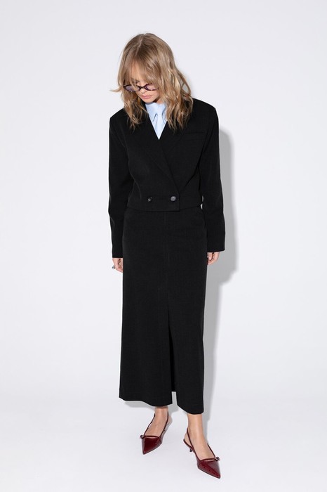 Костюм-двойка из укороченного оверсайз жакета с расширенной линией плеч и прямой макси-юбки с высоким разрезом.