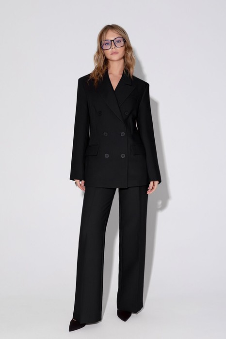 Детали: жакет свободного покроя и полуприлегающего силуэта, двубортная застежка на петли и пуговицы, отрезные бочки, пиджачный воротник, функциональные карманы, жакет на подкладке. Брюки с высокой посадкой, притачной пояс со шлевками, передние половины с небольшими застроченными мягкими складками и заутюженными стрелками, застежка на молнию и пуговицу, боковые карманы. Задние части брюк с вытачками и заутюженными стрелками. Пояс брюк прямой, без резинки.