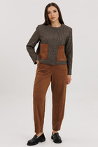 Детали: жакет свободного покроя и полуприлегающего силуэта, двубортная застежка на петли и пуговицы, отрезные бочки, пиджачный воротник, функциональные карманы, жакет на подкладке. Брюки с высокой посадкой, притачной пояс со шлевками, передние половины с небольшими застроченными мягкими складками и заутюженными стрелками, застежка на молнию и пуговицу, боковые карманы. Задние части брюк с вытачками и заутюженными стрелками. Пояс брюк прямой, без резинки.