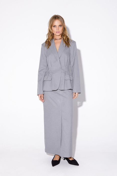 Текстильный костюм-двойка из укороченного приталенного жакета со складками и прямой макси-юбки с высоким разрезом.