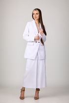 Детали: пиджачный воротник, перед с функциональными карманами, застежка на одну петлю и пуговицу, рукава втачные двухшовные, спинка с рельефами и резинкой по талии. Жакет на подкладке. Юбка с высокой посадкой на притачном поясе, потайная застежка в боковом шве, трикотажная подкладка.