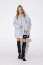 Костюм-двойка из жакета с контрастной шнуровкой и широких брюк-палаццо из текстильной ткани с пайетками.