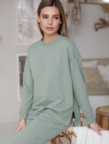 Детали: спущенная линия плеча, V-образный вырез горловины переда, длинные рукава с разрезами по низу, разрезы по бокам переда и спинки. Юбка прямого силуэта, пояс на резинке и без застежки, средний шов спинки с разрезом, без подкладки.