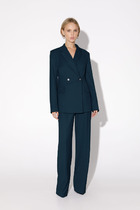 Текстильный костюм-двойка из удлиненного приталенного жакета и прямых брюк.