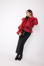 Атласный костюм-двойка из приталенной асимметричной блузы и широких брюк.