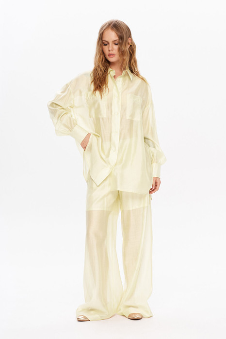 Полупрозрачный костюм-двойка из свободной рубашки и широких брюк на резинке.