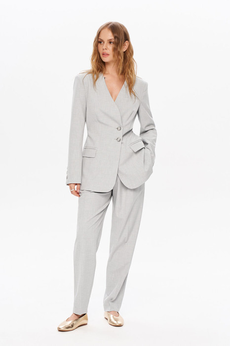 Детали: жакет полуприлегающего силуэта, перед с талиевыми вытачками, отрезные бочки переда и спинки, спинка с рельефами, функциональные карманы, смещенная застежка на петли и пуговицы, рукава втачные длинные с фигурной шлицей, съемный пояс, на подкладке 100% хлопок. Брюки с высокой посадкой, притачной пояс с резинкой и шнурами, без застежки, боковые карманы, передние части брюк со складками у пояса.