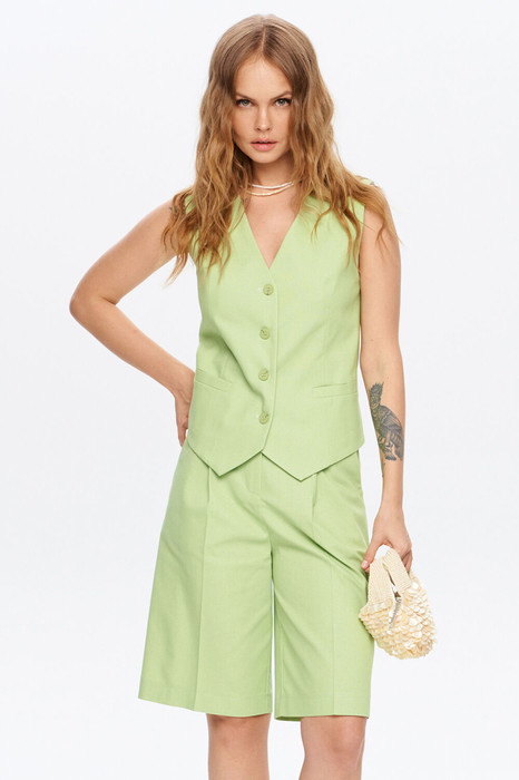 Льняной костюм-двойка из полуприлегающего жилета и шорт-бермуд.