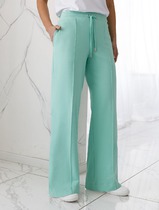 Детали: жилет прямого силуэта, талиевые вытачки переда и спинки, пиджачный воротник, застежка на пришивные кнопки, спинка со средним швом и шлицей, функциональные карманы, жилет на подкладке, в комплекте пояс из основной ткани и чёрный пояс-шнурок из кожзама. Брюки с высокой посадкой, притачной пояс со шлевками, передние половины с небольшими застроченными мягкими складками и заутюженными стрелками, застежка на молнию и пуговицу, боковые карманы. Задние части брюк с вытачками и заутюженными стрелками. Пояс брюк прямой, без резинки.