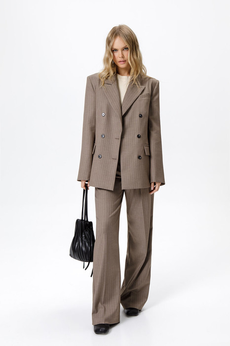 Текстильный костюм-двойка из свободного жакета и прямых широких брюк со стрелками.