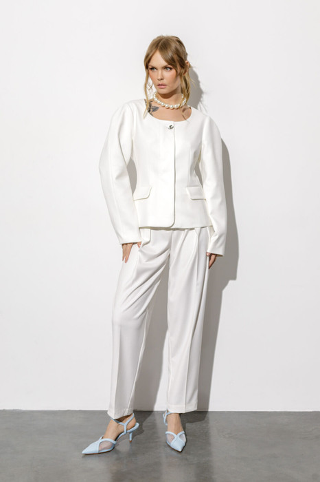 Комплект-двойка из приталенного жакета с круглым вырезом и свободных брюк со складками из текстильной ткани.
