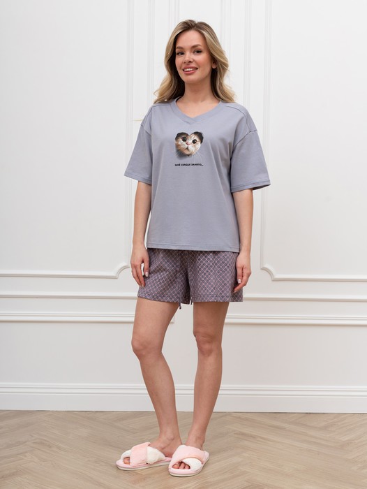 Костюм женский из трикотажного полотна «кулирка» в комбинации двух видов: с набивным рисунком и гладкокрашенного в единой цветовой гамме, состоящий из футболки и шорт.Футболка - из гладкокрашеного полотна, классического покроя, с короткими втачными рукавами, горловиной V- образной формы и принтом на полочке, выполненным в технике «шелкографии». Горловина обработана втачной планкой из основного материала.Шорты - из полотна с набивным рисунком, свободного покроя, укороченные, с карманами в боковых швах, на притачном поясе с эластичной тесьмой по талии и шнурком, продетым в две обметанные петли.