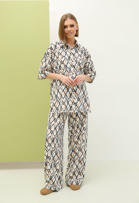 Костюм состоящий из блузы и брюк. Блуза свободного силуэта с центральной застежкой на петли-пуговицы. Перед с двумя накладными карманами. Спинка без среднего шва. Боковые швы заканчиваются разрезами. Рукав втачной одношовный короткий со спущенным плечевым швом. Воротник стояче-отложной на отрезной стойке. Брюки широкие свободного силуэта на притачном поясе с резинкой и втянутым в него поясом. На передних половинках расположены 2 боковых кармана. Длина рукава - 26 см, длина изделия - 75 см, длина брюк - 110 см.