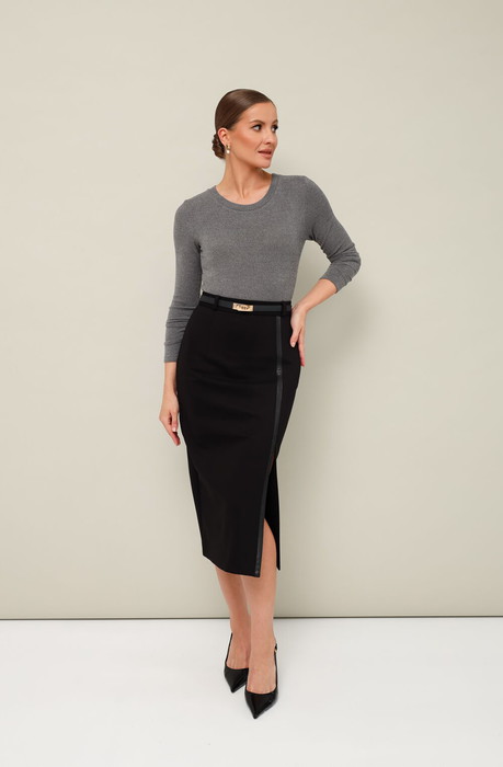 Комфортный трикотажный комплект, состоящий из джемпера и юбки. Джемпер прилегающего силуэта, с округлым вырезом горловины. Длинные втачные рукава. Юбка-карандаш, с притачным поясом со шлевками. По переду высокий разрез, который обработан планкой из экокожи. Застежка сзади, в среднем шве на потайную молнию.