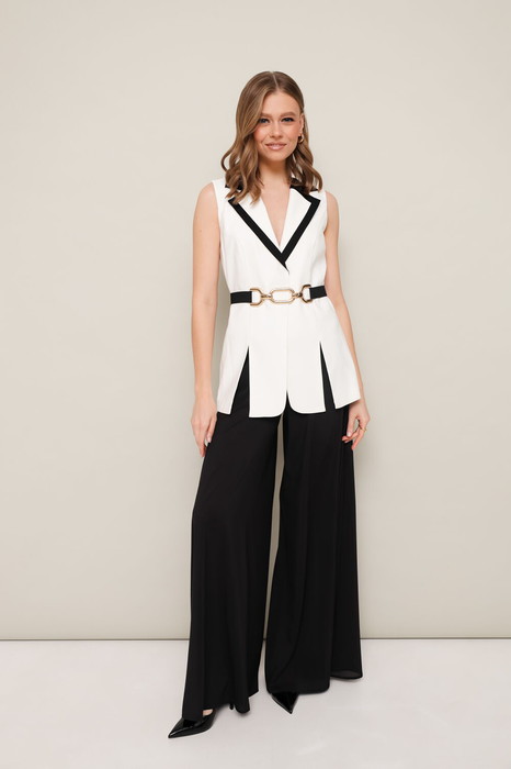 Элегантный комплект, состоящий из жилета и брюкпалаццо. Жилет полуприлегающего силуэта на х/б подкладке с воротником пиджачного типа с контрастной окантовкой. Центральная застежка на потайные кнопки. Перед с рельефами, переходящими в разрезы в нижней части жилета. Струящиеся брюки-палаццо свободного силуэта с расклешением от бедра, на притачном поясе, с застёжкой на потайную молнию в боковом шве. Брюки на частичной подкладке. В комплекте прилагается акцентный пояс на резинке с застежкой на кнопки.