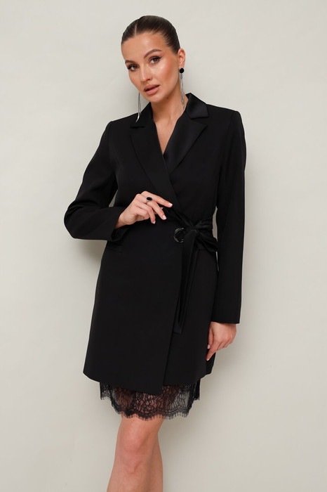 Нижнее платье-комбинация полуприлегающего силуэта. V-образный вырез горловины. Перед с нагрудными вытачками. Бретели регулируются по длине. По низу платья выполнена отделка в виде настрочного кружева. Лацканы, карманылисточки, завязки в области талии и нижнее платье-комбинация выполнены из гладкой ткани с благородным матовым блеском.