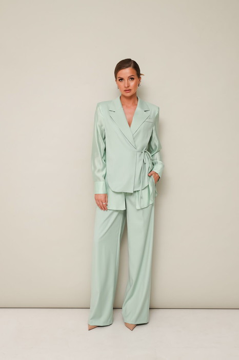 Жакет актуального прямого силуэта, с центральной застежкой на потайную пуговицу и завязками от бокового шва. Воротник пиджачного типа с отложными лацканами. Рукава втачные, с манжетами с застежкой на петли и пуговицы. Спинка с отрезной кокеткой. Рукава, спинка и частично перед, выполнены из легкой блузочной ткани.