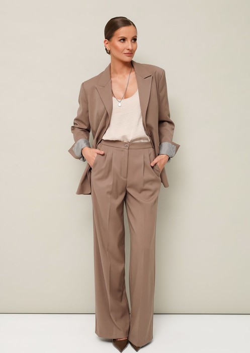 Стильный 2-предметный комплект, состоящий из жакета и брюк, выполнен из качественной костюмной ткани.