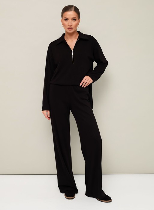 Комфортный брючный комплект с джемпером, выполнен из качественного трикотажного полотна. Джемпер прямого силуэта. Горловина с отложным воротником с застежкой на молнию. Длинные рукава со спущенной линией втачивания плеча. В боковых швах обработаны высокие разрезы. Брюки прямого кроя с посадкой на талии. Пояс обработан эластичной резинкой.