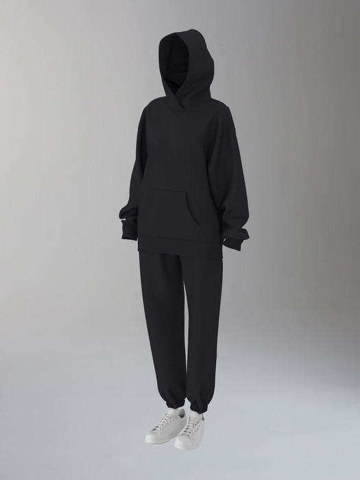 Женский спортивный костюм из плотного трикотажа с петельной изнанкой. Верх комплекта - толстовка-худи Оверсайз с капюшоном, с накладным карманом "кенгуру". Рукава толстовки втачные, свободные с заниженной линией плеча и с эластичными манжетами. Брюки свободные, на высоком поясе, книзу заужены на резинку. Карманы брюк наклонные, прорезные, с бочком. Пояс брюк по линии талии дополнительно регулируется шнуром.