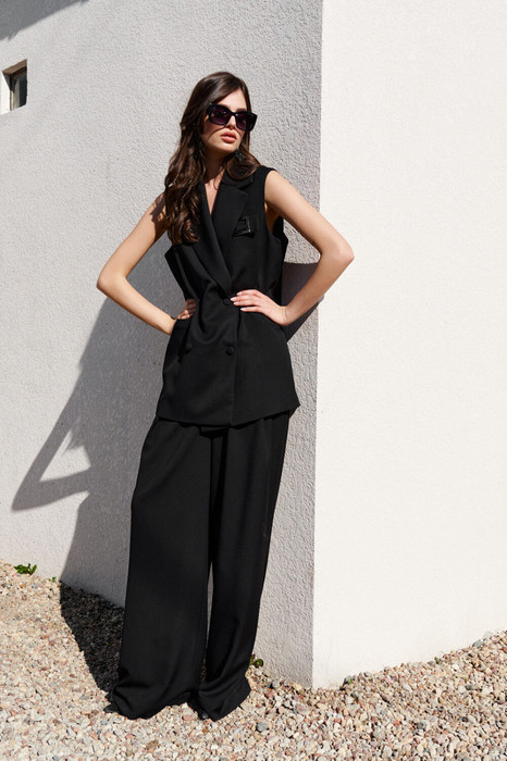 Жилетка прямого силуэта, длиной ниже линии бедер. Спинка с плечевой вытачкой с левой стороны, с ассиметричной складкой. По переду с правой стороны обработан карман с листочкой. В области груди на левом переде настрочен клапан с декоративной пряжкой. Воротник пиджачного типа с лацканами. Двубортная застежка по переду на петли и пуговицы. Жилетка на подкладке.