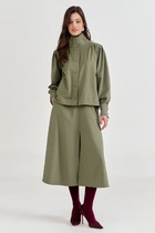 Костюм, состоящий из жакета и шорт. Жакет свободного кроя, длиной чуть ниже линии бедер. Спинка со средним швом, в котором обработана шлица. Перед с талиевой вытачкой, переходящей в карман. Карман прорезной с листочкой. Вырез V-образный, без воротника. Рукава одношовные, втачные, короткие. Жакет без застежки, на подкладке, с плечевыми накладками. Жакет дополняет съемный пояс. Шорты свободного кроя, длиной чуть выше середины бедра. По задним половинкам талиевые вытачки, прорезные карманы-«обманки» с листочкой. По передним половинкам застрочены стрелки, обработаны боковые карманы с наклонным входом. Застежка с гульфиком и откоском на тесьму-«молнию». Шорты на притачном поясе-обтачке. По поясу вставлены шлевки. Застежка по поясу на петлю и пуговицу.
