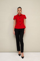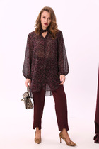 Комплект женский, состоящий из блузки и юбки. Блузка свободного кроя, длиной ниже линии бедер. Спинка со средним швом, в котором по горловине обработана застежка на навесную петлю и пуговицу. По переду нагрудные вытачки. Блузка без рукавов. Горловина округлой формы. блузку дополняет съемный пояс. Юбка А-образного силуэта, длиной чуть ниже щиколотки. Верхний срез юбки обработан резинкой.