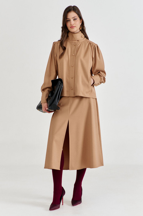 Комплект, состоящий из блузона и юбки. Блузон свободного кроя, длиной выше бедер. По спинке кокетка, переходящая на перед. По шву притачивания кокетки частичная сборка. По переду обработаны прорезные карманы «в рамку». По шву притачивания кокетки выполнена сборка. Рукава одношовные, втачные, длинные. По окату рукава заложены складки. По низу рукава заложены складки, разрез и притачная манжета. Разрез обработан цельнокроеной планкой. По манжете застежка на кнопки. По горловине воротник стойка. По воротнику настрочена пата. Застежка по переду на кнопки на притачной планке. Юбка А-образного силуэта, длиной до середины икры. Заднее полотнище со средним швом, в котором обработана застежка на потайную тесьму-«молнию». Переднее полотнище со средним швом, в котором обработан разрез. Юбка на притачном поясе-обтачке.