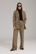 Костюм женский 2-х предметный блузон и брюки. Блузон женский прямого силуэта, длиной ниже линии бёдер на 5 см. Перед и спинка цельнокроеные. Перед декорирован принтом. На уровне линии талии 12 см от боковых швов по переду и спинке обработаны кулисы, собранные на эластичную тесьму. Горловина фигурная круглая обтачная без воротника. Блузон со спущенной проймой. Рукав втачной короткий одно шовный. По краю горловины, по краю низа рукава отделочная строчка 2,0 см; по шву втачивания рукава 0,6 см, по краю низа блузона 3,0 см. Блузон без плечевых накладок. Брюки женские, прямые, длинные. . Передние половинки по центру с декоративными защипами, шириной 0,6 см, с карманами в боковых швах. Задние половинки с таллиевыми вытачками задних половинок и защипами по передним собран на эластичную тесьму, закреплённую 2-мя отделочными строчками. Длина брюк по боковому срезу 100 см. Длина спинки блузона 65 см, длина рукава от горловины 17 см.