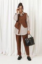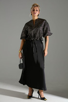 Костюм женский предназначен для повседневной носки. Костюм женский 2-х предметный блузка и юбка-брюки. Блузка женская прямого силуэта, длиной до линии бёдер. Перед с 2-мя нагрудными вытачками. Спинка с отрезной кокеткой, с 1-ной встречной складкой, кокетка декорирована пришивной металлической пластиной. Боковые швы с разрезами. Горловина круглая, обточная, без воротника. Рукав втачной одно шовный, короткий, с приточной отложной манжетой. Блузка без плечевых накладок. Юбка-брюки длинные широкие. Передние половинки с карманами в боковых швах с 2-мя односторонними зафиксированными складками на каждой половинке. Задние без конструктивных особенностей. Пояс притачной, собран на эластичную тесьму, закреплённую 2-мя отделочными строчками. Длина брюк по боковому срезу 90 см. Длина спинки блузона 56 см, длина рукава 22 см.
