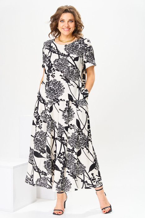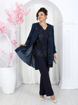 Костюм женский предназначен для повседневной носки. Костюм женский 2-х предметный блузка и юбка-брюки. Блузка женская прямого силуэта, длиной до линии бёдер. Перед с 2-мя нагрудными вытачками. Спинка с отрезной кокеткой, с 1-ной встречной складкой, кокетка декорирована пришивной металлической пластиной. Боковые швы с разрезами. Горловина круглая, обточная, без воротника. Рукав втачной одно шовный, короткий, с приточной отложной манжетой. Блузка без плечевых накладок. Юбка-брюки длинные широкие. Передние половинки с карманами в боковых швах с 2-мя односторонними зафиксированными складками на каждой половинке. Задние без конструктивных особенностей. Пояс притачной, собран на эластичную тесьму, закреплённую 2-мя отделочными строчками. Длина брюк по боковому срезу 90 см. Длина спинки блузона 56 см, длина рукава 22 см.