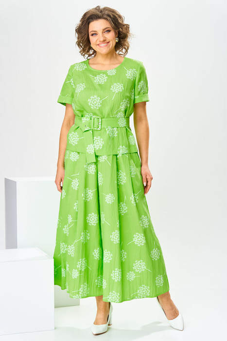 Костюм женский предназначен для повседневной носки. Костюм женский 2-х предметный блузка и юбка-брюки. Блузка женская прямого силуэта, длиной до линии бёдер. Перед с 2-мя нагрудными вытачками. Спинка с отрезной кокеткой, с 1-ной встречной складкой, кокетка декорирована пришивной металлической пластиной. Боковые швы с разрезами. Горловина круглая, обточная, без воротника. Рукав втачной одно шовный, короткий, с приточной отложной манжетой. Блузка без плечевых накладок. Юбка-брюки длинные широкие. Передние половинки с карманами в боковых швах с 2-мя односторонними зафиксированными складками на каждой половинке. Задние без конструктивных особенностей. Пояс притачной, собран на эластичную тесьму, закреплённую 2-мя отделочными строчками. Длина брюк по боковому срезу 90 см. Длина спинки блузона 56 см, длина рукава 22 см.