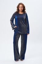 Костюм женский предназначен для повседневной носки. Костюм женский 2-х предметный блузон и юбка-брюки. Блузон прямого силуэта, длиной до линии бёдер с низом "ступенька". Перед с 2-мя нагрудными вытачками. Спинка цельнокроеная. Горловина круглая, обточная, без воротника. Рукав втачной, 2-х шовный, длиной 3/4. Блузон без плечевых накладок. Юбка-брюки длинные, широкие. Передние половинки с карманами в боковых швах с 2-мя зафиксированными односторонними складками с каждой стороны. Задние половинки без конструктивных особенностей. Юбка-брюки с приточным поясом, собранным частично на эластичную тесьму, закреплённую 2-мя отделочными строчками. К костюму прилагается съёмный пояс с пряжкой и 2-ю пробивными блочками. Длина брюк по боковому срезу 93см. Длина спинки блузона 64 см, длина рукава 49 см.
