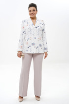 Костюм женский предназначен для повседневной носки. Костюм женский 2-х предметный блузка и брюки. Блузка женская свободного покроя, прямого силуэта, длиной ниже линии бёдер на 5 см с фигурным низом "ступенька". Перед с одним накладным прямоугольным карманом слева на уровне линии груди. Спинка с отрезной кокеткой и 2-мя односторонними складками. Боковые швы с разрезами. Горловина круглая с втачным воротником рубашечного типа, нижний воротник и верхняя стойка из отделочной ткани. Застёжка центральная на 7-мь вертикально обмётанных петель и 7-мь пришивных пуговиц. Блузка со спущенным плесом. Рукав втачной одно шовный длинный с притачной манжетой с застёжкой на 2-е обмётанные петли и 2-е пришивных пуговиц. Блузка со спущенным плечом. Рукав втачной, одно шовный, длинный, с притачной манжетой, с застёжкой на 2-е декоративные пуговицы. Блузка без плечевых накладок. Брюки женские прямые, широкие, длинные. Передние половинки с зафиксированными складками, с карманами в боковых швах, на левой на уровне талии фигурный клапан, с пришивной декоративной пуговицей. Задние половинки с таллиевыми вытачками. Застёжка центральная в среднем шве на тесьму-молнию. Брюки с притачным поясом, частичной собранным на эластичную тесьму, закреплённую 2-мя отделочными строчками, пояс с застёжкой на 1-ну обмётанную петлю и 1-ну пришивную пуговицу. Длина брюк по боковому срезу 102 см. Длина спинки блузки 73 см, длина рукава 49 см, длина рукава от горловины 73 см.