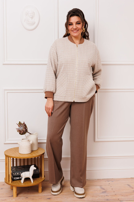 Костюм женский предназначен для повседневной носки. Костюм женский 2-х предметный жакет и брюки. Жакет женский прямого силуэта, длиной ниже линии бёдер. Перед с 2-мя нагрудными вытачками, с 2-мя накладными фигурными карманами. Спинка без конструктивных особенностей. Горловина круглая с втачной стойкой из отделочной ткани. Застёжка центральная бортовая на разъёмную тесьму-молнию. Жакет со спущенным плечом. Рукав втачной одно шовный, длинный с притачной манжетой из отделочной ткани. Жакет на притачной подкладке. Жакет без плечевых накладок. Брюки женские прямые длинные. Передние половинки с карманами в боковых швах с отрезным бочком. Задние половинки с таллиевыми вытачками. Брюки с притачным поясом, частично собранным на эластичную тесьму, закреплённую 2-мя отделочными строчками. Длина спинки жакета 65 см. Длина брюк по боковому срезу 103 см