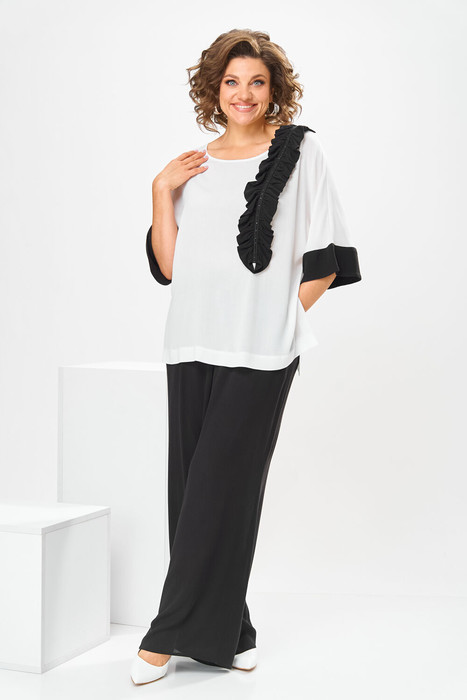 Костюм женский, 2-х предметный, блузка и брюки. Блузка женская, прямого силуэта, длиной ниже линии бёдер, с фигурным низом "ступенька". Перед цельнокроенный, с настрочным декором слева, с настрочной отделочной тесьмой. Спинка цельнокроенная. Горловина круглая, обточная, без воротника, длиной до локтя с притачной манжетой из отделочной ткани. Боковые швы с разрезами. Блузка без плечевых накладок. Брюки женские, прямые, длинные. Передние половинки с карманами в боковых швах. Задние половинки без конструктивных особенностей. Брючки с притачным поясом, собранным на эластичную тесьму (частично) и закреплённую 2-мя отделочными строчками. Длина спинки блузки 68,5 см, длина рукава 49 см. Длина брюк 105 см.