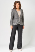 Костюм женский, предназначен для повседневной носки. Костюм женский, 2-х предметный жакет и юбка. Жакет прямого силуэта, длиной до линии бёдер с фигурным низом "ступенька". Перед с отрезными кокетками, с 2-мя нагрудными вытачками, с 2-мя притачными вертикальными планками, с 2-мя притачными горизонтальными планками внизу. На левой части кокетки настрочная аппликация. Спинка с отрезной кокеткой. Центральная часть переда и спинки на подкладке. Горловина круглая с втачным воротником, с закруглёнными концами. Застёжка центральная, бортовая, на вертикальных планках, на 5-ть обмётанных петель и 5-ть пришивных пуговиц. Жакет со спущенным плечом. Рукав втачной, длинный одно шовный на 2-е обмётанные петли и 2-е пришивные пуговицы. Жакет без плечевых накладок. Юбка женская, расширенная к низу, длинная с фигурным низом. Боковые швы с отлётными вертикальными планками, зафиксированными на юбке на 5-ть пришивных пуговиц на каждом боковом шве. Юбка с притачным поясом, собранным на эластичную тесьму, закреплённую 2-мя отделочными строчками. Юбка на подкладке. Длина спинки жакета 67 см, ширина рукава под проймой 21 см. Длина юбки по боковому шву без пояса 67 см.