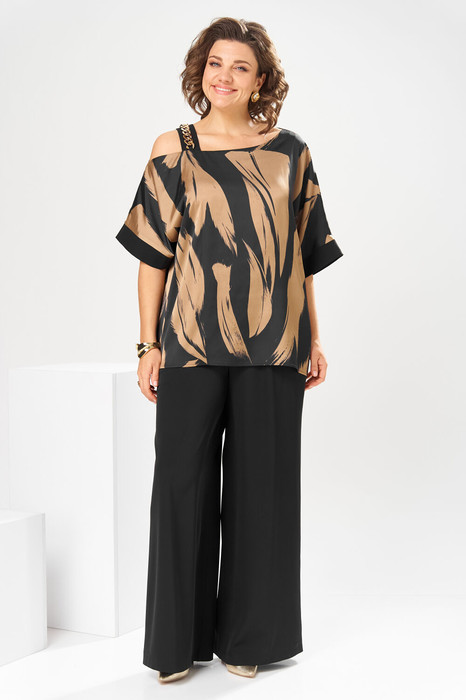 Костюм женский относится к нарядной торжественной одежде. Костюм женский, 2-х предметный, блузка и брюки. Блузка женская, прямого силуэта, свободного кроя, длиной до линии бёдер. Перед и спинка цельнокроенные. Горловина фигурная, обтачная, без воротника. Рукав цельнокроеный, длиной за локоть, с притачной манжетой из отделочной ткани, правый-с подрезом и обтачной бретелью из отделочной ткани с декоротивной тесьмой (цепь). Боковые швы с разрезами. Блузка без плечевых накладок. Брюки женские прямые, длинные. Передние половинки с карманами а боковых швах. Задние половинки с таллиевыми вытачками. Брюки с притачным поясом собранным на эластичную тесьму, закреплённую 2-мя отделочными строчками. Длина брюк по боковому срезу 105 см, длина брюк по шаговому шву 77 см. Длина спинки блузки 65 см, ширина рукава 23 см.
