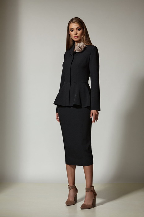 Комплект женский  из стрейчевой  костюмной ткани на подкладке.    Жакет приталенного силуэта с рельефами по переду и спинке, отрезной по линии талии, с роскошной баской. Утонченности добавляет небольшой воротник округлой формы. Рукава - втачные, двухшовные.  Застежка на пришивные кнопки. Изюминка комплекта - стильный цветок ручной работы.   Юбка на подкладке, слегка зауженная к низу, без пояса. Верх юбки обработан обтачкой. Шлица в среднем шве заднего полотнища юбки обеспечит свободу движения. Застежка - молния в среднем шве юбки.