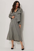 Комплект из костюмной ткани на подкладке, состоящий из жакета и юбки. Жакет прямого силуэта с нагрудными вытачками и прорезными карманами с клапанами. Воротник - стойка. Рукава - реглан, длинные. Жакет застегивается на пришивные кнопки. Цветок ручной работы, расположение можно поменять самостоятельно. Юбка на подкладке, с отлетной деталью и поясом-обтачкой. В среднем шве заднего полотнища юбки - застежка-молния и разрез.