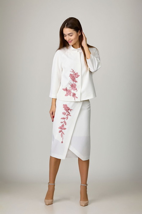Комплект из костюмной ткани на подкладке, состоящий из жакета и юбки. Жакет прямого силуэта с нагрудными вытачками. Воротник - стойка. Рукава - реглан, трехчетвертные. Жакет застегивается на пришивные кнопки. Юбка на подкладке,  с отлетной деталью и поясом-обтачкой. Отделочные  настрочные  детали  по жакету и юбке.  В среднем шве заднего полотнища юбки - застежка-молния и разрез.